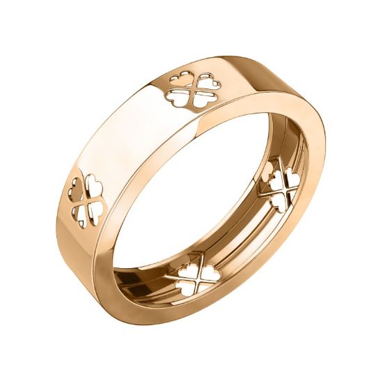 Дизайн: лаконичный, но выразительный. Широкая гладкая лента кольца украшена сквозным узором в виде четырёхлистных клеверов, равномерно распределённых по окружности.