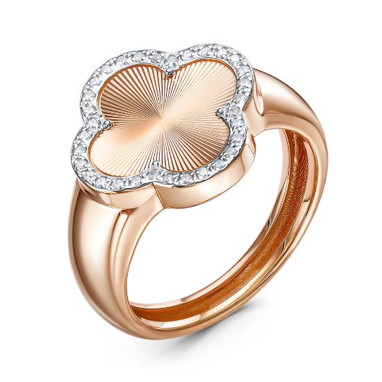 Элегантное кольцо из красного золота 585 пробы, украшенное изысканным декором в форме клевера. Центральная часть кольца выполнена с радиальной гравировкой, создающей эффект солнечных лучей, а по краям расположены сверкающие фианиты, которые добавляют изделию блеска и утонченности.