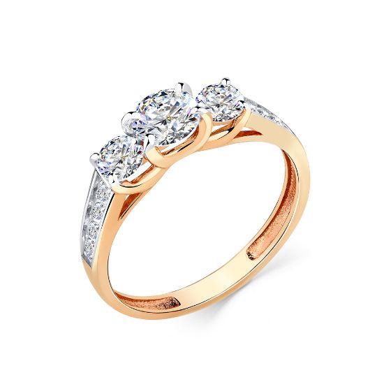 Золотое кольцо с тремя крупными фианитами и мелкими фианитами на ободке — это изысканное украшение, которое сочетает в себе элегантность и блеск.