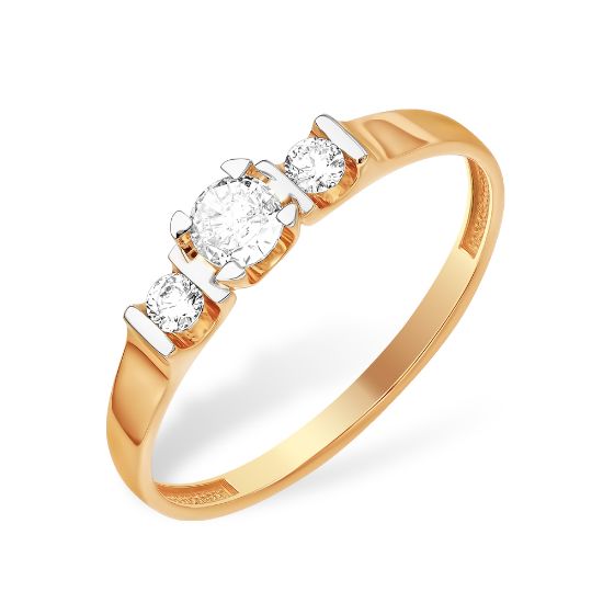Это изысканное кольцо выполнено из красного золота 585 пробы, что гарантирует его долговечность и благородный блеск. Центральным элементом украшения являются три фианита, расположенные в ряд, которые придают кольцу ослепительное сияние. Дизайн отличается плавными линиями и утонченным переплетением, создавая ощущение легкости и элегантности.