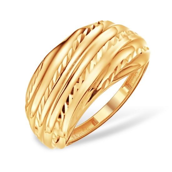 Это кольцо из красного золота 585 пробы с изысканным дизайном. Оно выполнено в классическом стиле с плавными линиями и текстурным узором, который придаёт украшению глубину и объём. Поверхность кольца украшена гравировкой, создающей эффект игры света и тени, что делает его особенно привлекательным.