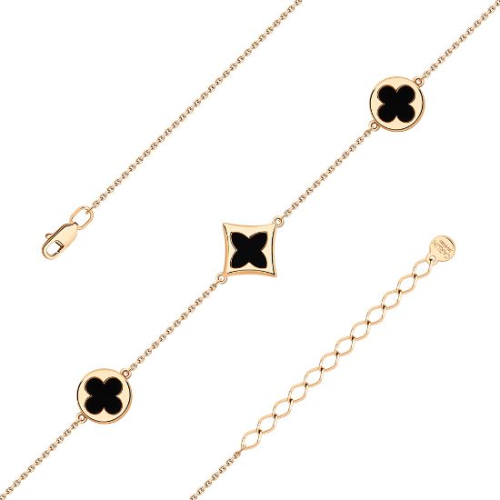 Элегантный золотой браслет с изысканным акцентом в виде клевера из оникса — это не просто украшение, а символ удачи и гармонии. Его минималистичный дизайн делает его универсальным аксессуаром, который идеально дополнит как повседневный, так и вечерний образ.