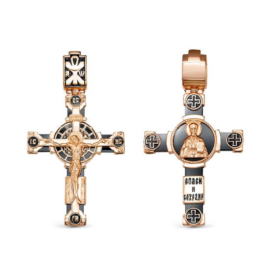 Представляем изысканный нательный крест, сочетающий в себе глубокий религиозный смысл и утончённую ювелирную работу. Изделие выполнено из высококачественного золота с вставками из благородного оникса, что придаёт ему особую выразительность и статусность.