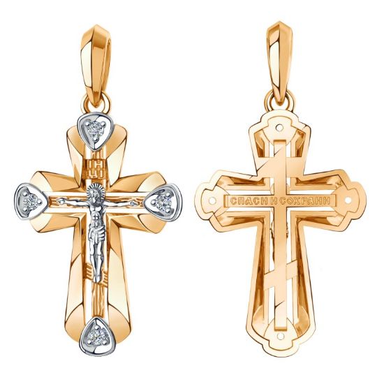 Этот изысканный крестик выполнен из красного золота 585 пробы, что придаёт ему особую элегантность и утончённость. На лицевой стороне изображено распятие Иисуса Христа, а на обратной стороне выгравирована надпись «Спаси и Сохрани», символизирующая защиту и благословение. Украшение дополнено вставками из фианитов, которые придают изделию блеск и изысканность.