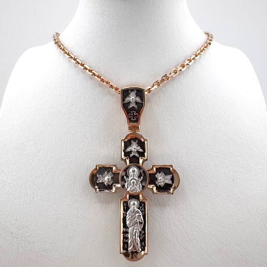 Оборотная сторона: украшена иконой Богородицы с Младенцем и образом святого, что придаёт кресту дополнительную духовную силу. Изображения выполнены с высокой детализацией, подчёркивая мастерство ювелиров.