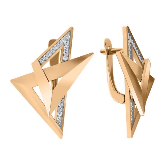 Эти серьги станут ярким акцентом вашего образа! Они выполнены из золота с изящными треугольными элементами, украшенными сверкающими циркониями. Дизайн сочетает в себе геометрическую строгость и женственную элегантность, что делает их универсальным аксессуаром для любого случая.
