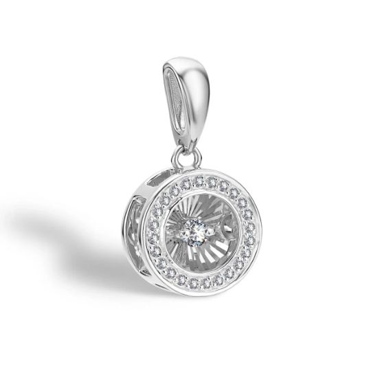 Эта изысканная подвеска станет настоящим украшением вашего образа. Она выполнена из белого золота и украшена центральным танцующим бриллиантом, который создает эффект движения и блеска. Вокруг центрального камня расположены мелкие бриллианты, обрамляющие его в изящную оправу.
