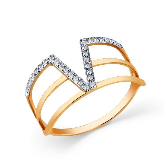 Это изысканное кольцо выполнено из золота и украшено фианитами, которые придают ему блеск и элегантность. Дизайн кольца отличается оригинальностью: оно состоит из двух перекрещивающихся полос, образующих форму буквы «V». Верхняя часть кольца инкрустирована фианитами, что делает его ярким акцентом в любом образе.