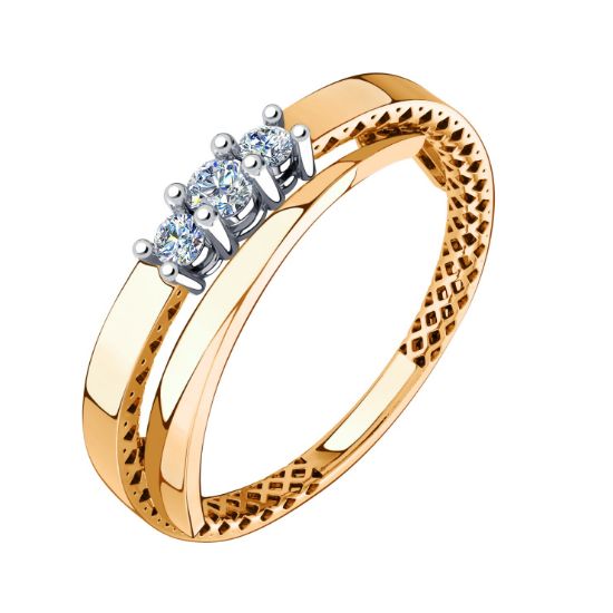 Дизайн: Кольцо выполнено из золота 585 пробы с изысканным ажурным узором на внутренней стороне. Оно украшено тремя крупными фианитами, которые придают изделию блеск и элегантность.