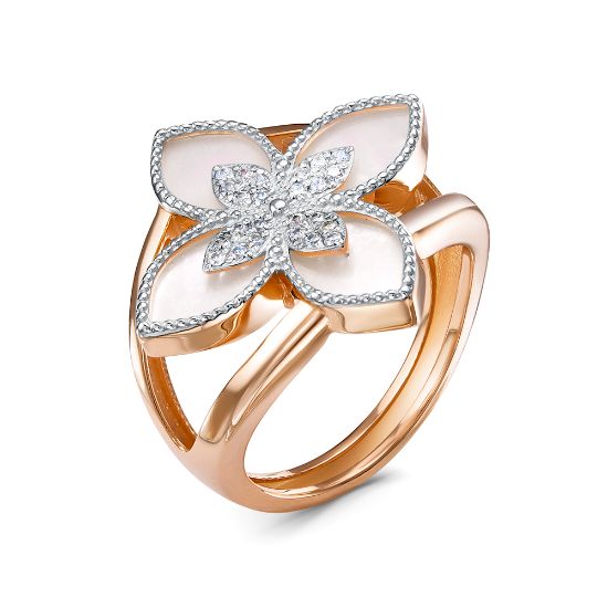 Элегантное кольцо из красного золота 585 пробы с изысканным дизайном станет украшением для любого случая. Центральным элементом украшения является цветок, выполненный из перламутра, который обрамлен сверкающими фианитами. Этот аксессуар подчеркнет вашу утонченность и стиль, добавив образу нотку роскоши.