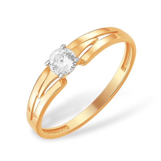 Кольцо выполнено из красного золота 585 пробы. Оно украшено крупным фианитом, который закреплён в изящной оправе. Дизайн кольца отличается плавными линиями и утончённым переплетением, что делает его универсальным украшением для любого случая.