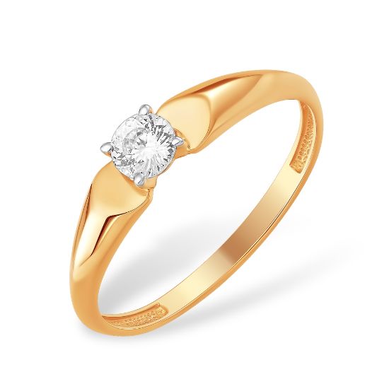 Это изящное золотое кольцо 585 пробы с минималистичным дизайном. Оно выполнено из красного золота и украшено одним крупным фианитом круглой огранки, закрепленным в четырехзубую оправу.