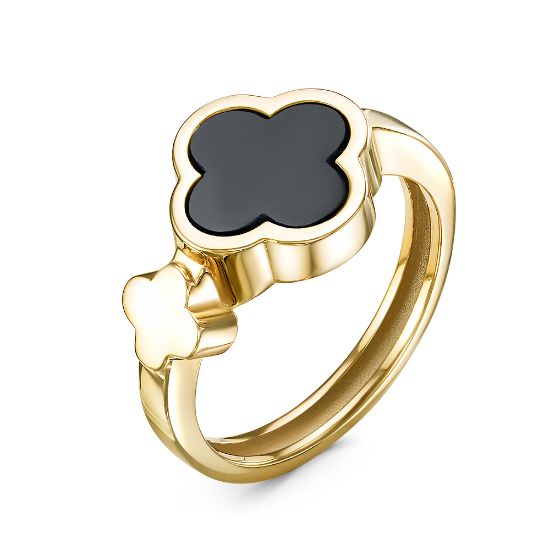 Элегантное кольцо из золота 585 пробы с черным ониксом станет изысканным акцентом в вашем образе. Центральный элемент украшения — гладкий черный оникс, обрамленный в форме клевера, что придает изделию уникальный и утонченный вид.