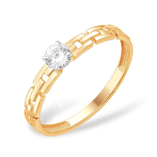 Кольцо выполнено из красного золота 585 пробы. Оно украшено одним крупным бриллианитом, который закреплён в центре изделия. Дизайн кольца отличается изящными геометрическими элементами, придающими ему современный и элегантный вид.
