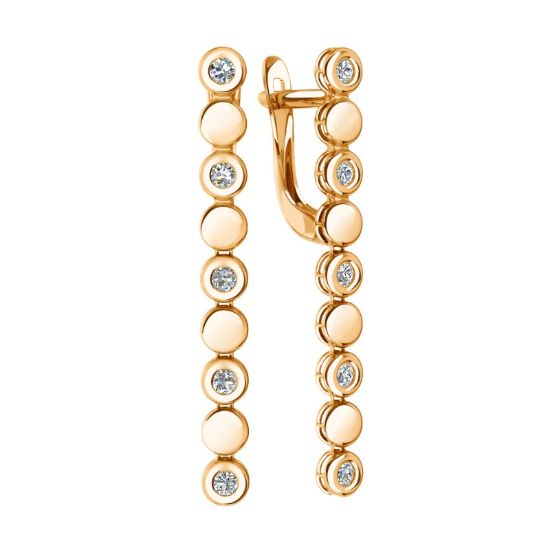 Серьги выполнены в виде цепочки из чередующихся золотых и матовых элементов, украшенных сверкающими фианитами. Каждый камень тщательно закреплён, что обеспечивает долговечность и блеск изделия.