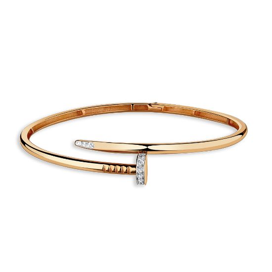 Золотой браслет — это изысканное украшение, выполненное из красного золота 585 пробы. Его дизайн вдохновлен формой гвоздя, что придает изделию уникальный и современный вид. Браслет украшен фианитами, которые добавляют блеска и элегантности.